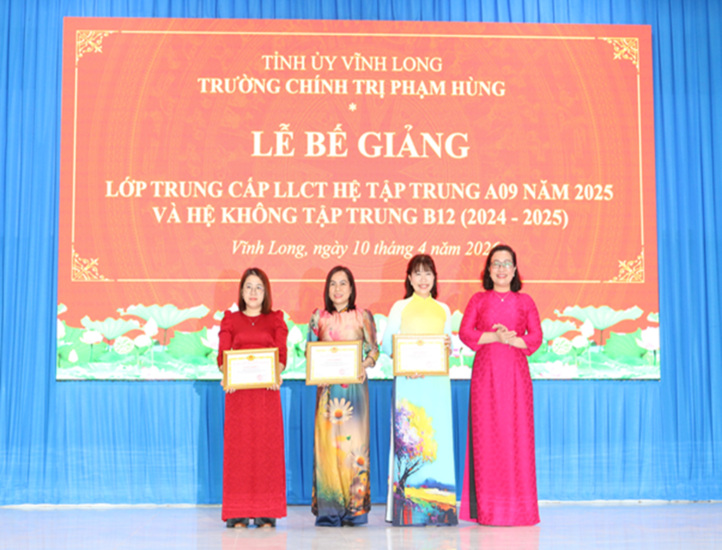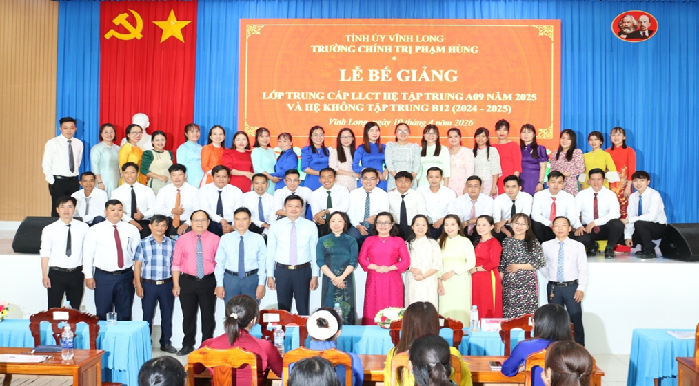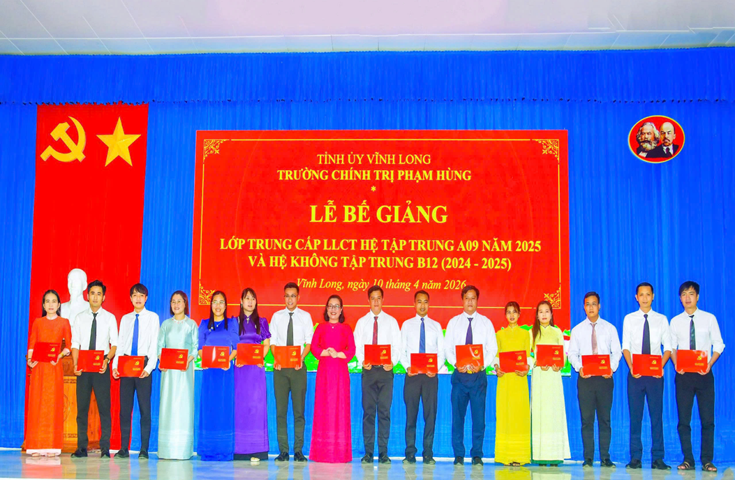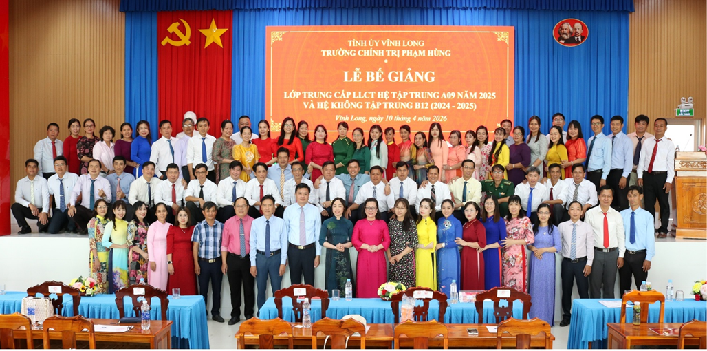 Chiều ngày 10/4/2026, Trường Chính trị Phạm Hùng tỉnh Vĩnh Long (Cơ sở 3) tổ chức Lễ bế giảng các lớp Trung cấp lý luận chính trị hệ tập trung A09 năm 2025 và hệ không tập trung B12 (2024 - 2025).