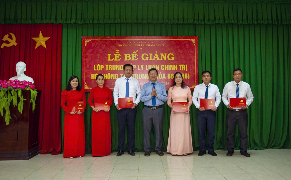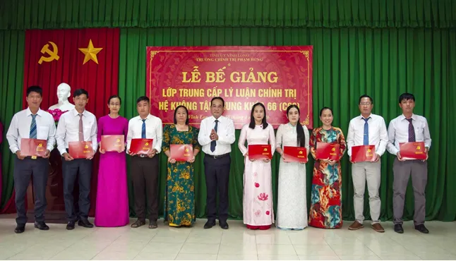 Chiều ngày 10/4/2026, Trường Chính trị Phạm Hùng tỉnh Vĩnh Long (Cơ sở 2) tổ chức lễ bế giảng cho học viên lớp Trung cấp lý luận chính trị hệ không tập trung khóa 66 (C66).